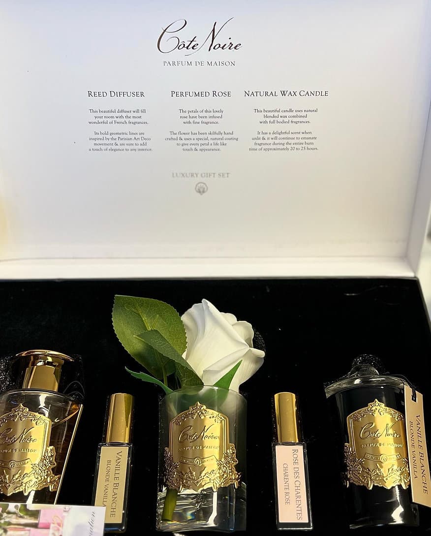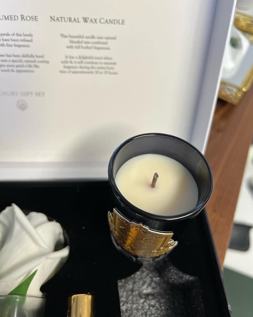 Cofret Cotê Noir composto por uma mini vela, rosa e mikadu.